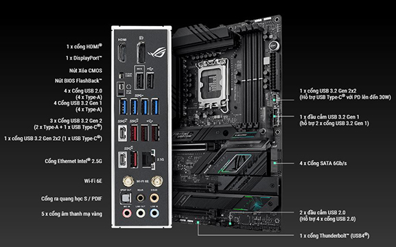 Cổng kết nối ROG STRIX Z790-F GAMING WIFI được trang bị đẩy đủ các cổng kết nối để bạn dễ dàng lắp đặt.