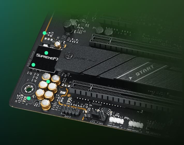 Công nghệ âm thanh SupremeFX Công nghệ âm thanh ROG SupremeFX tích hợp đảm bảo âm thanh nguyên bản cho dòng ROG STRIX Z790-F GAMING WIFI, đảm bảo tần số đáp ứng cho âm thanh đặc trưng, rõ ràng. Nó còn cung cấp hai đầu cắm mặt trước được điều khiển bởi bộ khuếch đại amps mang lại âm thanh chất lượng cao cho tai nghe chơi game. |