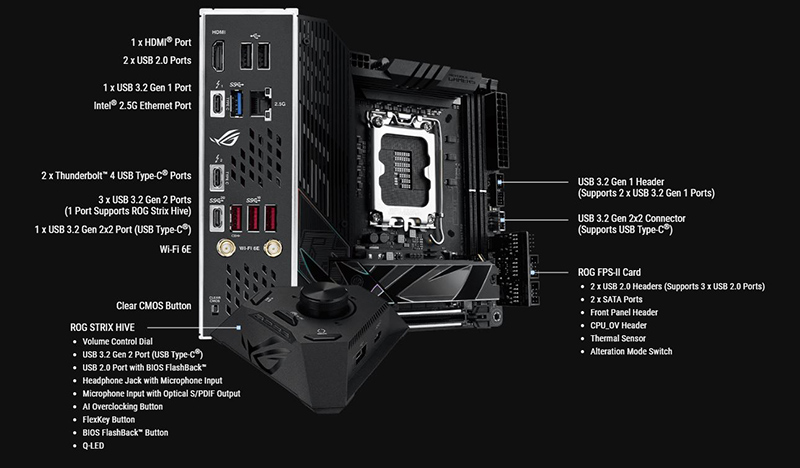 Cổng kết nối ROG STRIX Z790-I GAMING WIFI được trang bị đẩy đủ các cổng kết nối để bạn dễ dàng lắp đặt.