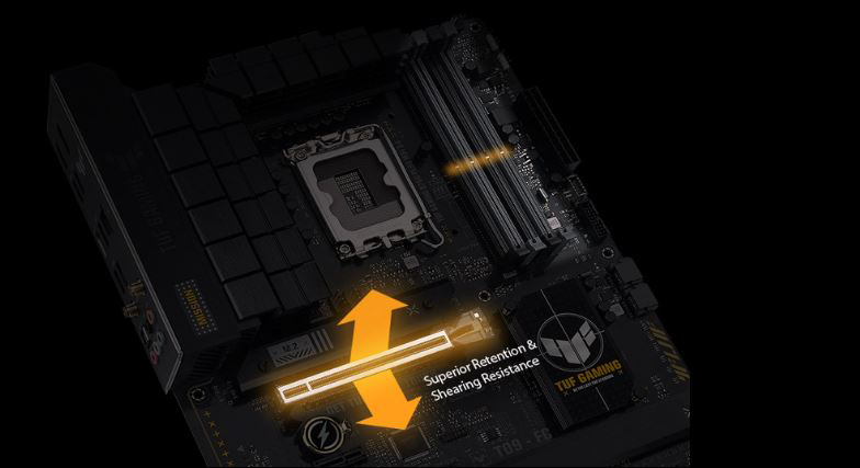 SafeSlot SafeSlot & SafeDIMM PCIe 5.0 nhanh hơn gấp 2 lần so với PCIe 4.0, vì vậy để đảm bảo tốc độ dữ liệu cao nhất, SafeSlot PCIe độc quyền của TUF GAMING B760M-PL7US WIFI D4 trang bị một vỏ bọc kim loại gia cố được thêm vào cung cấp độ bám mạnh và độ bền trượt vượt trội so với các khe cắm mở rộng tiêu chuẩn. |
