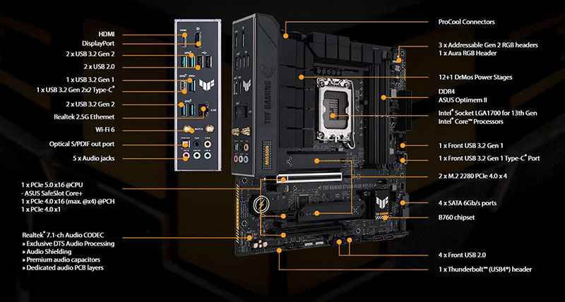 Cổng kết nối TUF GAMING B760M-PLUS WIFI D4 được trang bị đẩy đủ các cổng kết nối để bạn dễ dàng lắp đặt.
