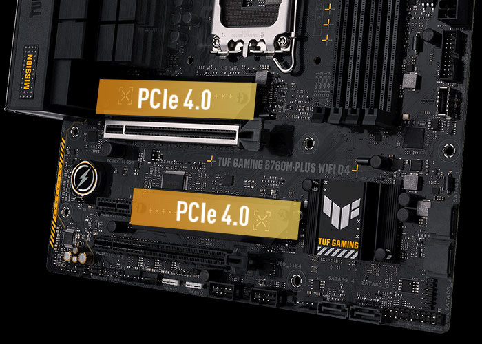 Hỗ trợ M.2 PCIe 4.0 (Lên đến 64Gbps) TUF GAMING B760M-PLUS WIFI D4 hỗ trợ 2 khe cắm M.2 PCIe 4.0 và cung cấp hỗ trợ NVMe SSD RAID để tăng hiệu suất đáng kinh ngạc. Tạo cấu hình RAID với thiết bị lưu trữ PCIe để tận hưởng tốc độ truyền dữ liệu nhanh nhất trên nền tảng Intel thế hệ mới. |