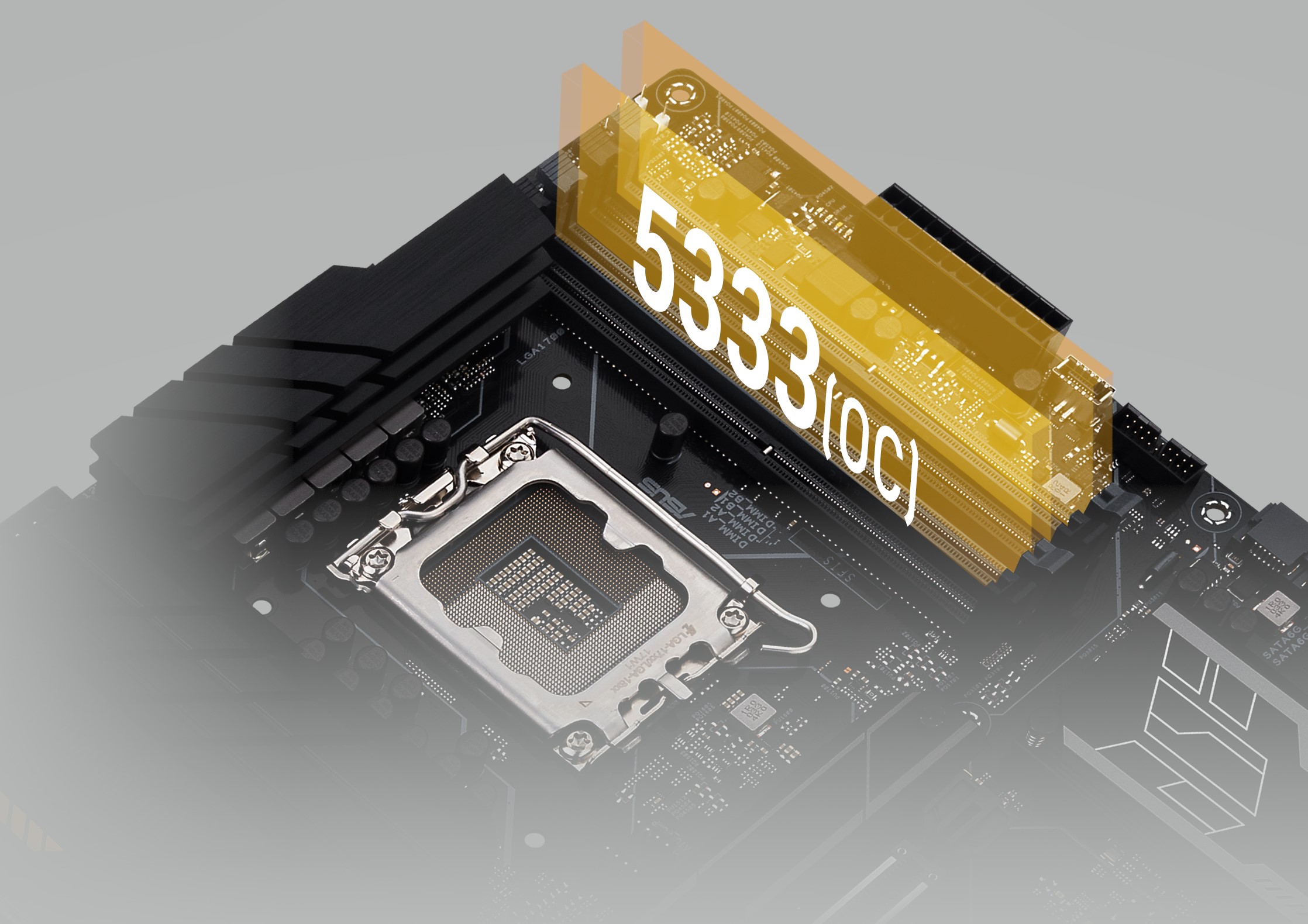 DRAM OverClocking TUF GAMING B760M-PLUS WIFI D4 hỗ trợ ép xung RAM đến 5333 MHz, cung cấp khả năng truy cập băng thông bộ nhớ và bổ sung các vùng che chắn giúp giảm đáng kể nhiễu xuyên âm |