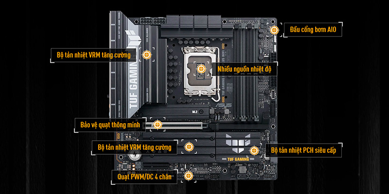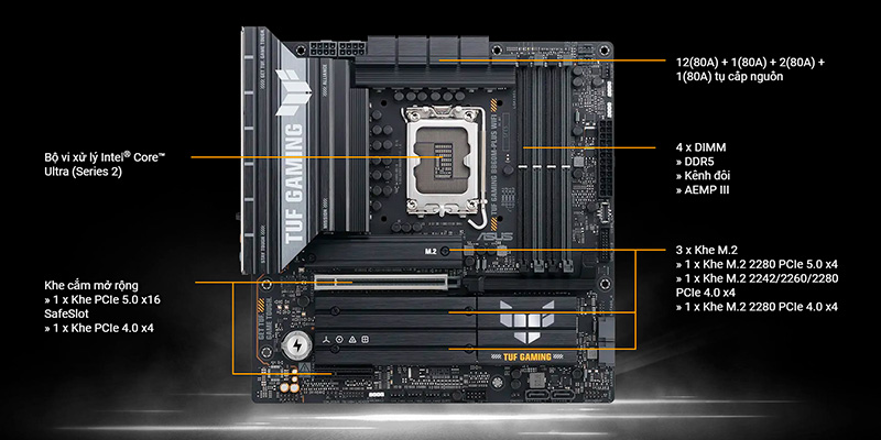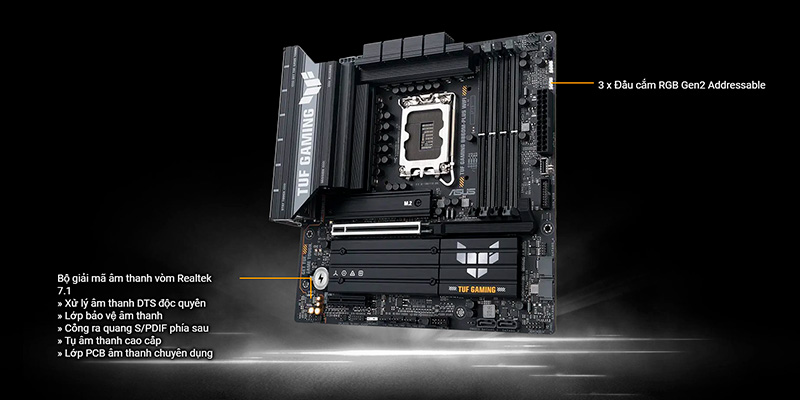 Mainboard ASUS TUF GAMING B860M-PLUS WIFI DDR5 gây ấn tượng mạnh với thiết kế gaming độc đáo, kết hợp hài hòa giữa hai màu trắng bạc và xám, đem đến vẻ ngoài cực kỳ nổi bật và hiện đại. Đèn LED RGB Aura Sync được tích hợp trên bo mạch, giúp bạn dễ dàng tùy chỉnh ánh sáng theo phong cách cá nhân, tạo nên điểm nhấn đẳng cấp và bắt mắt cho hệ thống PC của bạn. Hơn nữa, thiết kế tối ưu giúp hệ thống luôn mát mẻ ngay cả khi hoạt động cường độ cao, đảm bảo tuổi thọ linh kiện được kéo dài tối đa.