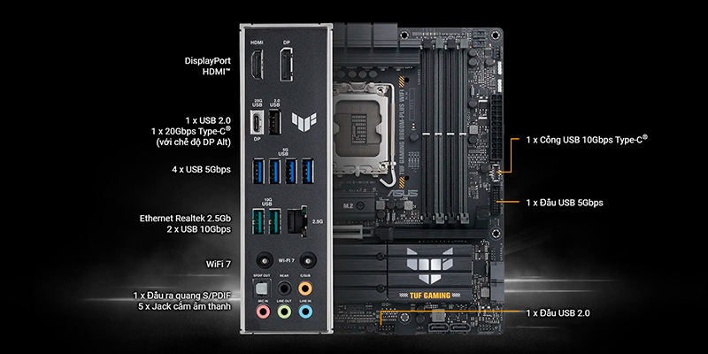 Mainboard ASUS TUF GAMING B860M-PLUS WIFI DDR5 hỗ trợ đa dạng cổng kết nối như USB4 20Gbps Type-C, USB 3.2 Gen2x2, HDMI 2.1 và DisplayPort 1.4, cho phép bạn kết nối cùng lúc nhiều thiết bị ngoại vi tốc độ cao. Các tính năng tiện lợi như PCIe Q-Release và M.2 Q-Latch cũng giúp việc lắp ráp và thay thế linh kiện trở nên đơn giản hơn, tiết kiệm thời gian cho người dùng khi xây dựng hoặc nâng cấp hệ thống PC của mình.