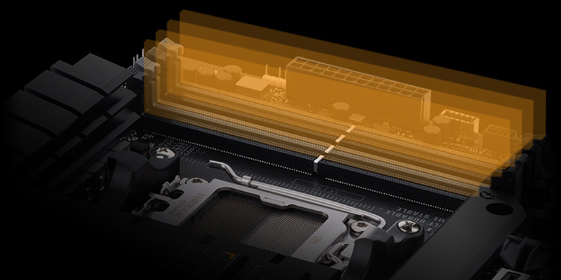Mainboard PC ASUS TUF GAMING X670E-PLUS hỗ trợ ép xung RAM DDR5 đến 8000+(O.C.) MHz, cung cấp khả năng truy cập băng thông bộ nhớ.
