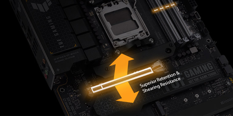 Mainboard PC ASUS TUF GAMING X670E-PLUS trang bị khe PCIe 5.0 cung cấp tốc độ truyền dữ liệu gấp đôi PCIe 4.0 - nó đủ mạnh mẽ để xử lý các tác vụ mới nặng về dữ liệu. SafeSlot Core + là một vỏ bọc kim loại gia cố được thêm vào khe cắm PCIe để giữ thẻ được lắp chắc chắn. Trong khi đó, vỏ bọc SafeDIMM hỗ trợ và bảo vệ các mô-đun bộ nhớ trên một số bo mạch chủ ASUS cho phép bạn lắp các mô-đun của mình với tốc độ, độ chính xác và sự tự tin.
