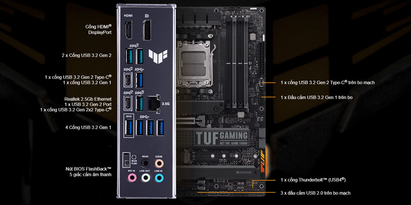 Mainboard PC ASUS TUF GAMING X670E-PLUS được trang bị đẩy đủ các cổng kết nối để bạn dễ dàng lắp đặt.