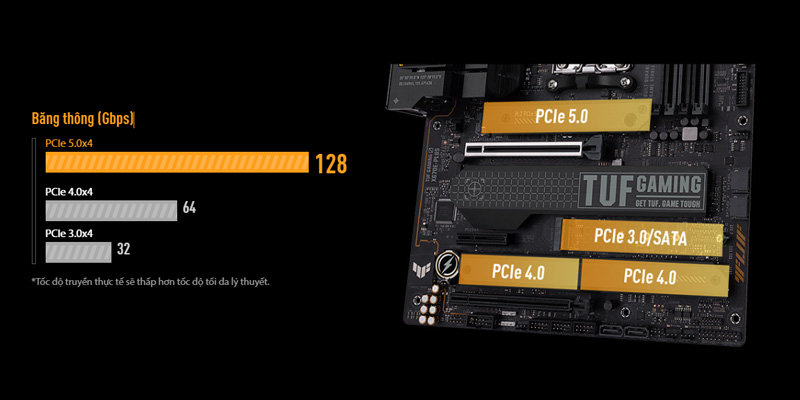 Mainboard PC ASUS TUF GAMING X670E-PLUS cũng có một khe cắm PCIe 5.0 M.2 để trải nghiệm tốc độ truyền dữ liệu nhanh nhất lên đến 128 Gbps* và tất cả các khe cắm M.2 đều hỗ trợ cấu hình NVMe và SATA RAID để tận dụng tốc độ hiện có mới nhất.