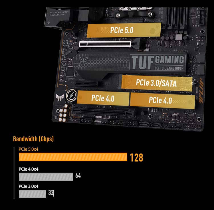 Khe M.2 PCIe lên đến 5.0 TUF GAMING X670E-PLUS WIFI cung cấp đến 4 khe cắm M.2 hỗ trợ tốc độ truyền dữ liệu với hiệu suất đáng kinh ngạc. Hơn nữa trong đó có một khe cắm M.2 hỗ trợ PCIe 5.0 với tốc độ truyền dữ liệu lên đến 128 Gbps cho phép thời gian khởi động và tải ứng dụng nhanh hơn. * Tốc độ truyền thực tế sẽ thấp hơn tốc độ tối đa lý thuyết. |