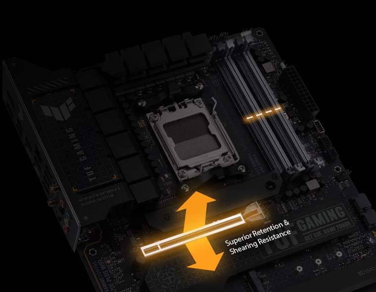 SafeSlot Core+ & SafeDIMM TUF GAMING X670E-PLUS WIFI trang bị khe PCIe 5.0 cung cấp tốc độ truyền dữ liệu gấp đôi PCIe 4.0 - nó đủ mạnh mẽ để xử lý các tác vụ mới nặng về dữ liệu. SafeSlot Core + là một vỏ bọc kim loại gia cố được thêm vào khe cắm PCIe để giữ thẻ được lắp chắc chắn. Trong khi đó, vỏ bọc SafeDIMM hỗ trợ và bảo vệ các mô-đun bộ nhớ trên một số bo mạch chủ ASUS cho phép bạn lắp các mô-đun của mình với tốc độ, độ chính xác và sự tự tin. |