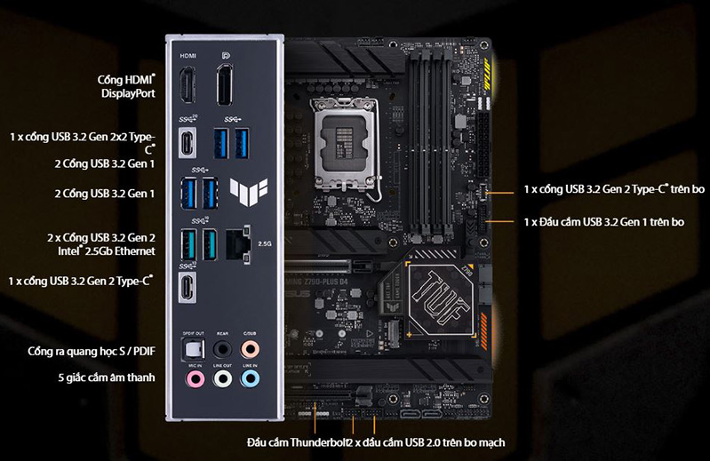 Cổng kết nối ASUS TUF GAMING Z790-PLUS D4 được trang bị đẩy đủ các cổng kết nối để bạn dễ dàng lắp đặt.