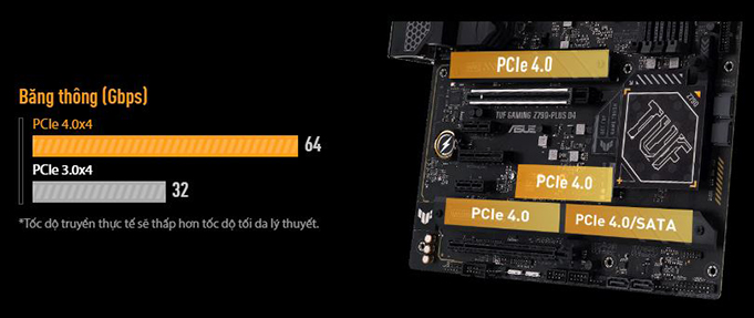 Hỗ trợ M.2 PCIe 4.0 ASUS TUF GAMING Z790-PLUS D4 hỗ trợ đến 4 khe cắm M.2 PCIe 4.0 và cung cấp hỗ trợ NVMe SSD RAID để tăng hiệu suất đáng kinh ngạc. Tạo cấu hình RAID với thiết bị lưu trữ PCIe để tận hưởng tốc độ truyền dữ liệu nhanh nhất. |