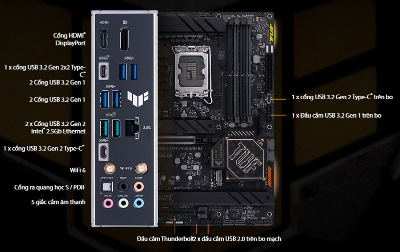 Cổng kết nối ASUS TUF GAMING Z790-PLUS WIFI D4 được trang bị đẩy đủ các cổng kết nối để bạn dễ dàng lắp đặt.