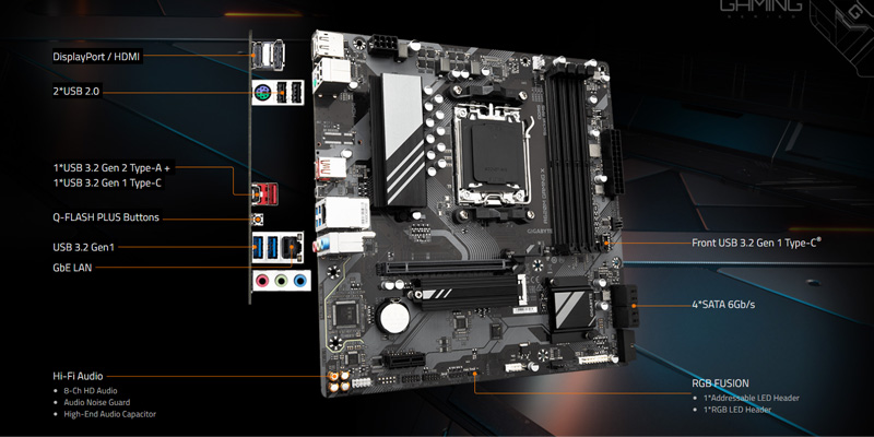 Mainboard PC Gigabyte A620M GAMING X được trang bị đẩy đủ các cổng kết nối để bạn dễ dàng lắp đặt.
