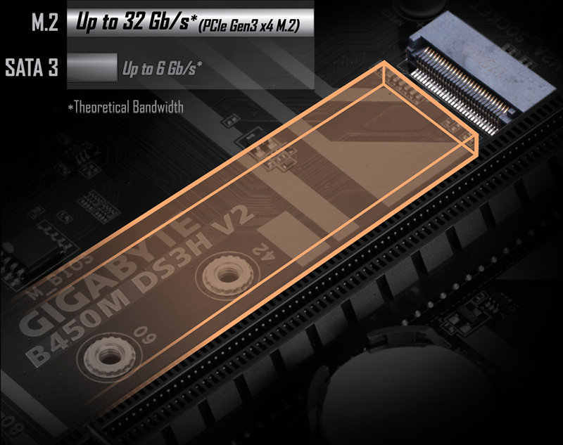 B450M DS3H V2 hỗ trợ khe cắm M.2 PCIe 3.0 và cung cấp hỗ trợ NVMe SSD RAID để tăng hiệu suất đáng kinh ngạc. Tạo cấu hình RAID để tận hưởng tốc độ truyền dữ liệu nhanh nhất trên nền tảng thế hệ mới.