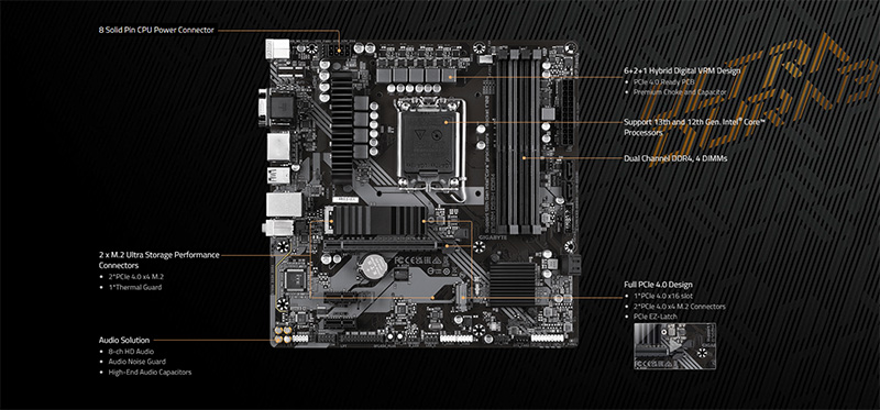 DRAM OverClocking B760M DS3H DDR4 hỗ trợ ép xung DRAM DDR4 đến 5333+ OC, cung cấp khả năng truy cập băng thông bộ nhớ và bổ sung các vùng che chắn giúp giảm đáng kể nhiễu xuyên âm |