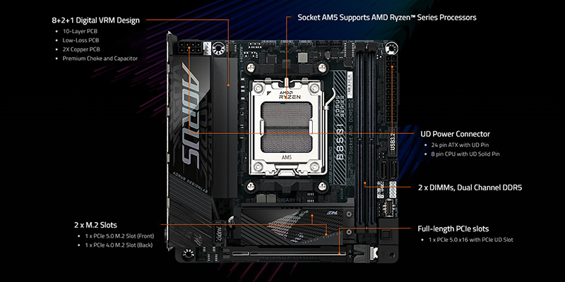 Sở hữu thiết kế Mini-ITX nhỏ gọn, Gigabyte B850I AORUS PRO là giải pháp lý tưởng cho các bộ PC tiết kiệm không gian mà vẫn đảm bảo hiệu năng. Kích thước nhỏ không làm ảnh hưởng đến khả năng nâng cấp, với nhiều tính năng hiện đại được tích hợp như khe PCIe 5.0 và hỗ trợ RAM DDR5, mang lại sự linh hoạt tối đa trong việc xây dựng cấu hình.
