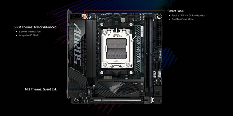 Hệ thống tản nhiệt trên Gigabyte B850I AORUS PRO được thiết kế tối ưu với các tấm làm mát lớn, giúp duy trì nhiệt độ ổn định ngay cả khi hoạt động ở cường độ cao. Khe M.2 đi kèm tản nhiệt độc lập đảm bảo hiệu suất ổn định cho các ổ cứng SSD, tránh hiện tượng quá nhiệt trong quá trình sử dụng lâu dài.