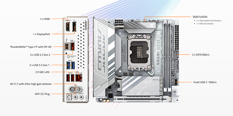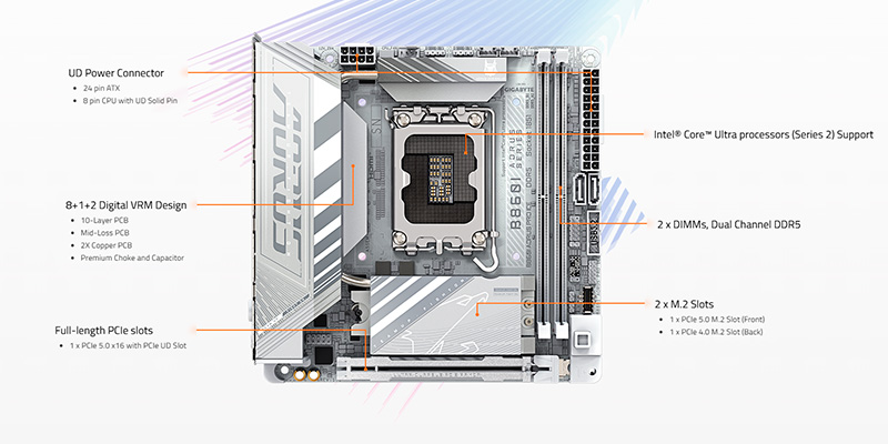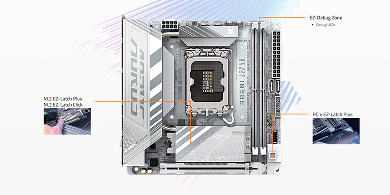 Sản phẩm được trang bị khe cắm PCIe 5.0 với tốc độ truyền tải vượt trội, đảm bảo hỗ trợ các thiết bị lưu trữ SSD NVMe tốc độ cao hoặc card đồ họa thế hệ mới. Mainboard PC Gigabyte B860I AORUS PRO ICE giúp tăng cường hiệu năng tổng thể, rút ngắn thời gian tải ứng dụng và cải thiện trải nghiệm sử dụng.