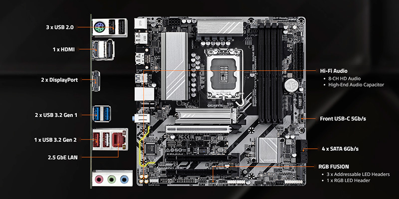 Mainboard hỗ trợ các cổng kết nối hiện đại như USB 3.2 Gen 2, HDMI, và DVI, mang lại khả năng tương thích linh hoạt với nhiều thiết bị ngoại vi. Cổng LAN tốc độ cao giúp đảm bảo kết nối mạng ổn định và nhanh chóng, phù hợp với cả nhu cầu làm việc và giải trí.