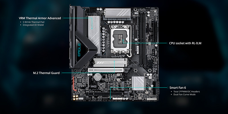 Bo mạch chủ này được trang bị hệ thống tản nhiệt Smart Fan 6 với các cảm biến nhiệt và khả năng điều chỉnh quạt tự động. Điều này không chỉ giúp giữ nhiệt độ ổn định trong mọi điều kiện sử dụng mà còn giảm tiếng ồn, mang lại trải nghiệm làm việc và chơi game thoải mái.