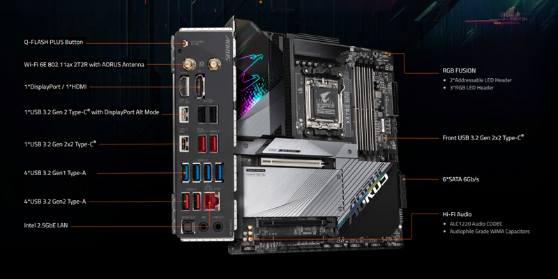 Mainboard PC Gigabyte X670E AORUS MASTER được trang bị đẩy đủ các cổng kết nối để bạn dễ dàng lắp đặt.