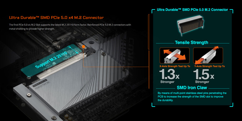 Mainboard PC Gigabyte X670E AORUS MASTER hỗ trợ khe cắm M.2 PCIe 5.0 và cung cấp hỗ trợ NVMe SSD RAID để tăng hiệu suất đáng kinh ngạc. Tạo cấu hình RAID với thiết bị lưu trữ PCIe để tận hưởng tốc độ truyền dữ liệu nhanh nhất trên nền tảng Intel thế hệ mới.