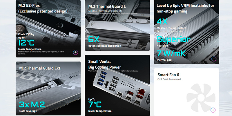 Mainboard tích hợp chip âm thanh Realtek ALC1220, hỗ trợ âm thanh vòm 7.1 và S/PDIF Out, đem lại chất lượng âm thanh chuyên nghiệp. Hệ thống tản nhiệt đa lớp ICE Heatsink kết hợp nhiều đầu cắm quạt/pump giúp duy trì hiệu suất làm mát tốt. Nhờ đó, bo mạch chủ luôn đảm bảo hiệu năng ổn định ngay cả khi hoạt động trong thời gian dài hoặc ép xung mạnh mẽ.