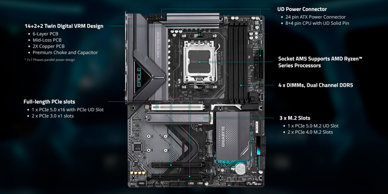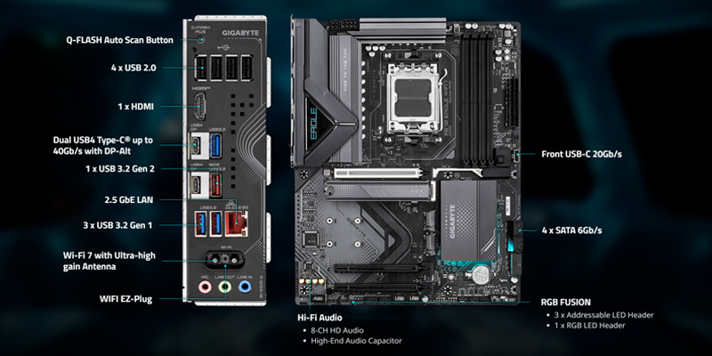 Mainboard PC Gigabyte X870 EAGLE WIFI 7 là sự lựa chọn lý tưởng cho những ai đam mê công nghệ và hiệu năng đỉnh cao. Với khả năng hỗ trợ các công nghệ mới nhất như socket AM5, PCIe 5.0 và WiFi 7, cùng thiết kế mạnh mẽ và giải pháp tản nhiệt tối ưu, Gigabyte X870 EAGLE WIFI 7 sẽ là nền tảng vững chắc cho hệ thống máy tính của bạn.