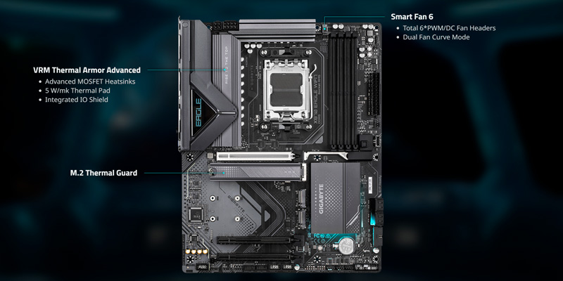 Gigabyte X870 EAGLE WIFI 7 được trang bị hệ thống tản nhiệt tiên tiến, bao gồm các heatsink lớn và ống dẫn nhiệt hiệu quả, giúp giải nhiệt nhanh chóng cho các linh kiện quan trọng, đảm bảo hệ thống luôn hoạt động ổn định ở hiệu suất cao ngay cả khi chịu tải nặng.