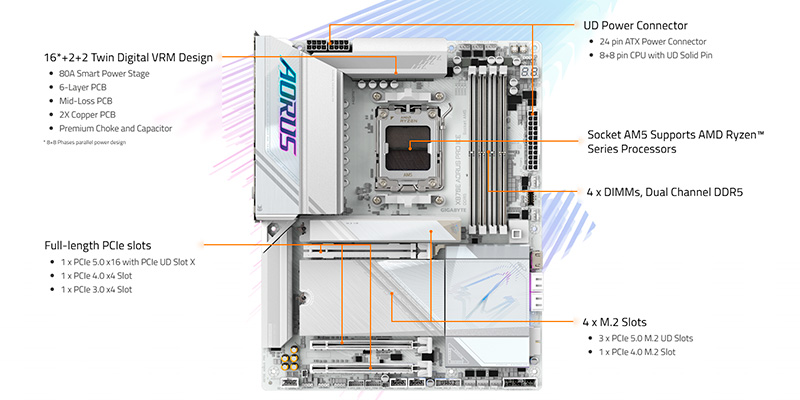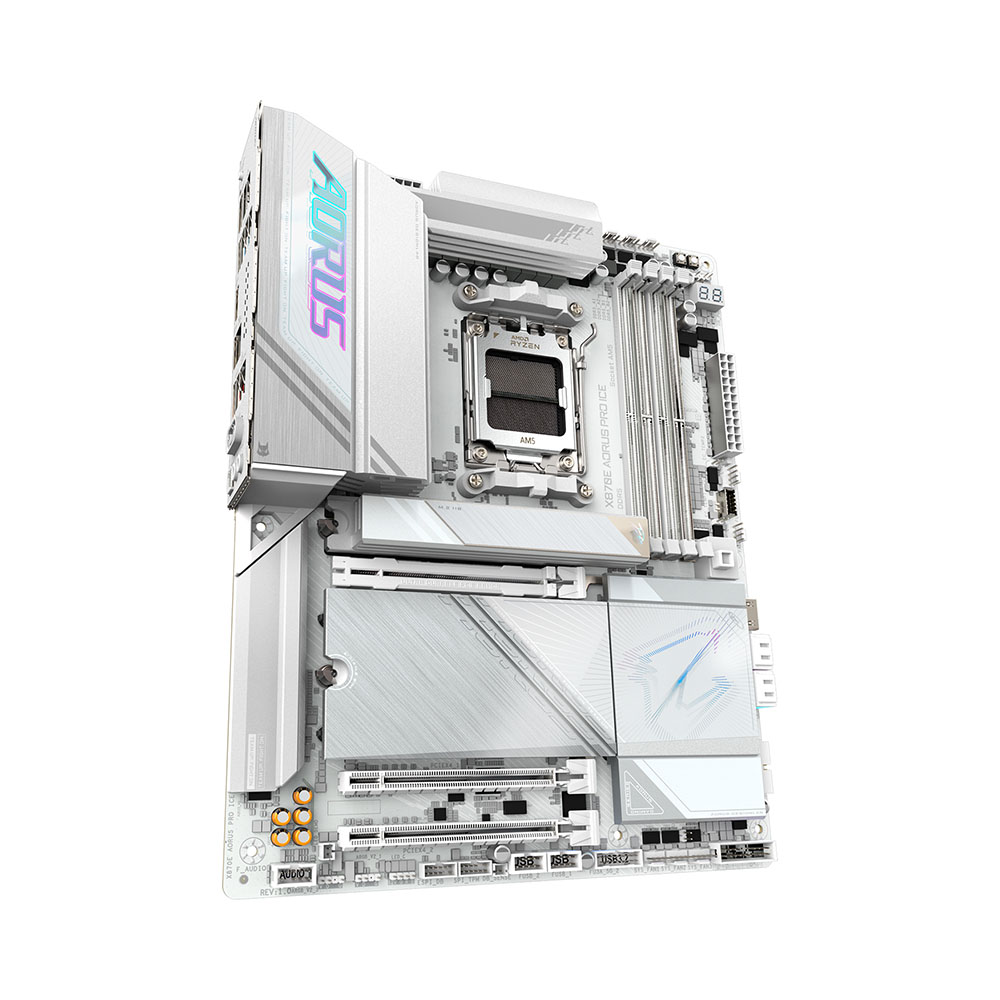 Mainboard PC Gigabyte X870E AORUS PRO ICE WIFI7 DDR5 được trang bị 3 khe M.2 Gen5 (CPU) và 1 khe M.2 Gen4 (Chipset), hỗ trợ RAID 0/1/5/10, cho phép người dùng xây dựng hệ thống lưu trữ NVMe cực nhanh. Khe PCIe 5.0 x16 mang lại băng thông tối đa cho card đồ họa thế hệ mới, đồng thời bo mạch vẫn tích hợp thêm 2 khe PCIe x4 (Gen4 và Gen3) cho khả năng mở rộng linh hoạt. Đây là nền tảng hoàn hảo cho những cấu hình PC cao cấp, gaming 4K/8K và sáng tạo nội dung chuyên nghiệp.