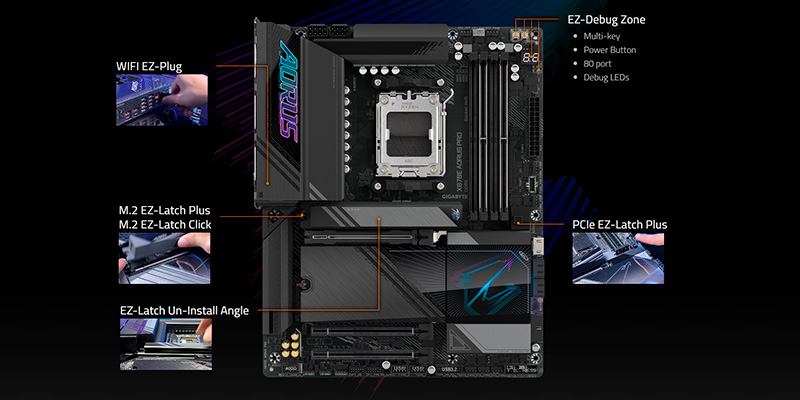 Trang bị chipset AMD X870E, bo mạch chủ này hỗ trợ toàn diện AMD Ryzen 9000, 8000 và 7000 series trên socket AM5, mang lại hiệu năng mạnh mẽ và độ ổn định cao. Với 4 khe DDR5 DIMM hỗ trợ dung lượng lên đến 256GB, tốc độ ép xung 8200+ MHz (OC), người dùng có thể dễ dàng tận dụng tối đa băng thông bộ nhớ cho cả gaming lẫn xử lý dữ liệu nặng. Hỗ trợ AMD EXPO và Intel XMP, sản phẩm đảm bảo trải nghiệm ép xung đơn giản, an toàn nhưng hiệu quả.
