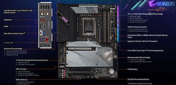 Cổng kết nối Z690 AORUS ELITE AX DDR4 được trang bị đẩy đủ các cổng kết nối để bạn dễ dàng lắp đặt.