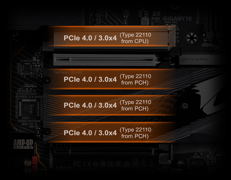 Khe cắm M.2 PCIe Gen 4 Z790 AORUS ELITE AX DDR4 hỗ trợ khe cắm M.2 PCIe 4.0 và cung cấp hỗ trợ NVMe SSD RAID để tăng hiệu suất đáng kinh ngạc. Tạo cấu hình RAID với thiết bị lưu trữ PCIe để tận hưởng tốc độ truyền dữ liệu nhanh nhất trên nền tảng Intel thế hệ mới. |