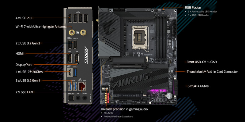 Mainboard PC Gigabyte Z790 AORUS ELITE X WIFI7 được trang bị đẩy đủ các cổng kết nối để bạn dễ dàng lắp đặt