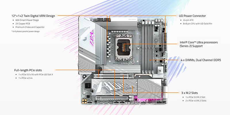 Gigabyte Z890M AORUS ELITE WIFI7 ICE trang bị khe PCIe 5.0 x16, mang lại băng thông lớn, giúp hệ thống tận dụng tối đa sức mạnh của các GPU thế hệ mới. Với khả năng hỗ trợ card đồ họa cao cấp, bo mạch chủ này giúp bạn trải nghiệm gaming ở mức FPS cao và làm việc với các phần mềm đồ họa chuyên nghiệp một cách mượt mà.