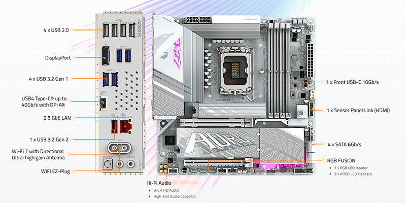 Mainboard này hỗ trợ USB4 Type-C, cho phép truyền tải dữ liệu lên đến 40Gbps, hỗ trợ xuất hình ảnh độ phân giải cao qua DisplayPort. Ngoài ra, Gigabyte Z890M AORUS ELITE WIFI7 ICE còn được trang bị nhiều cổng USB 3.2 Gen2 và Gen1, giúp kết nối nhanh chóng với các thiết bị ngoại vi như chuột, bàn phím, ổ cứng ngoài hay tai nghe gaming.
