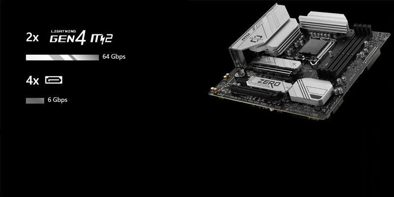 Mainboard PC MSI B760M PROJECT ZERO hỗ trợ khe cắm M.2 PCIe 4.0 và cung cấp hỗ trợ NVMe SSD RAID để tăng hiệu suất đáng kinh ngạc. Tạo cấu hình RAID với thiết bị lưu trữ PCIe để tận hưởng tốc độ truyền dữ liệu nhanh nhất.
