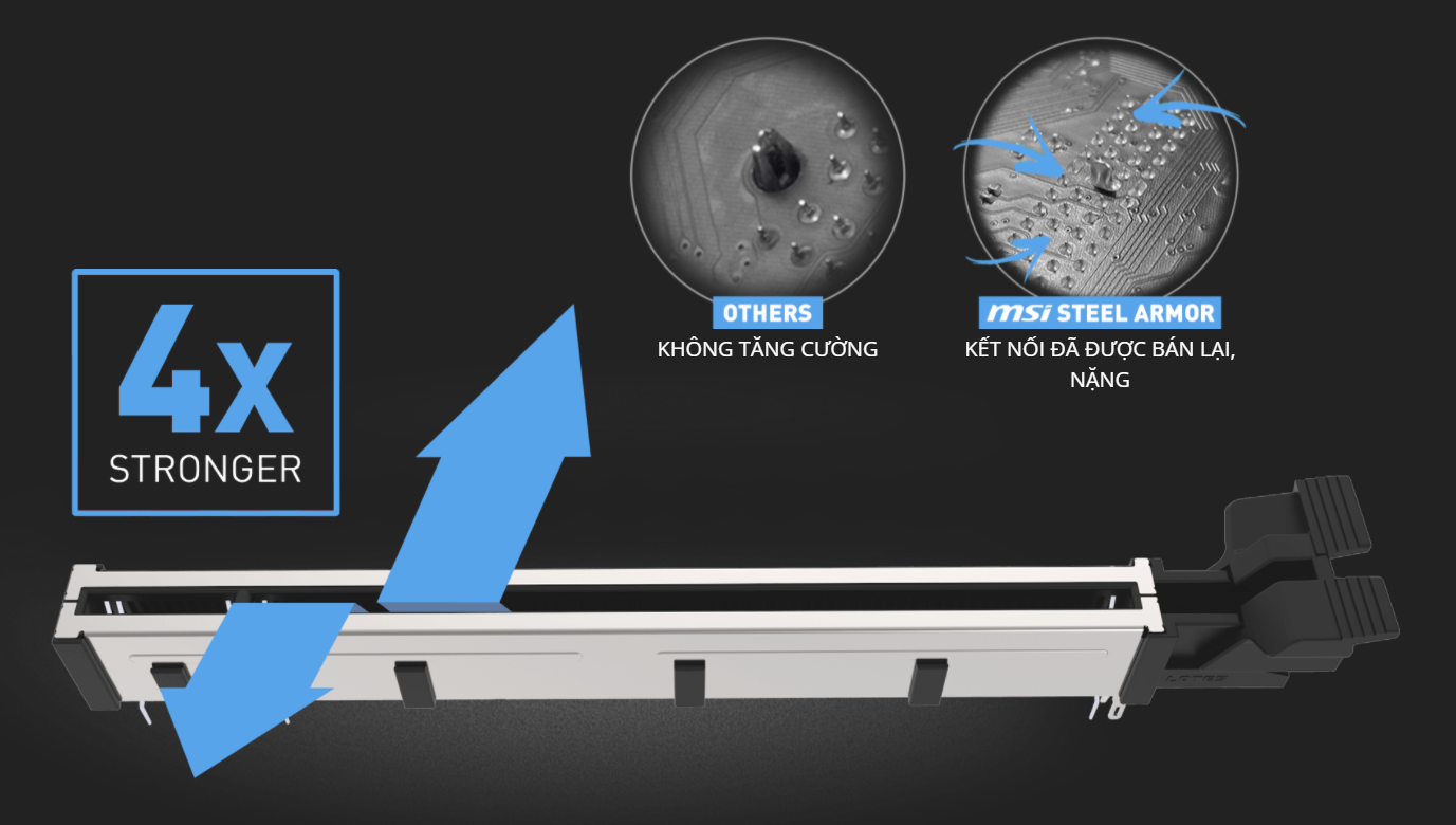 MSI Lightning Gen 4 PCI-E MSI Lightning Gen 4 PCI-E x16 mang đến tốc độ vượt trội lên đến 64GB/s, giúp giảm nhiễu, hỗ trợ băng thông và tốc độ truyền tín hiệu. |