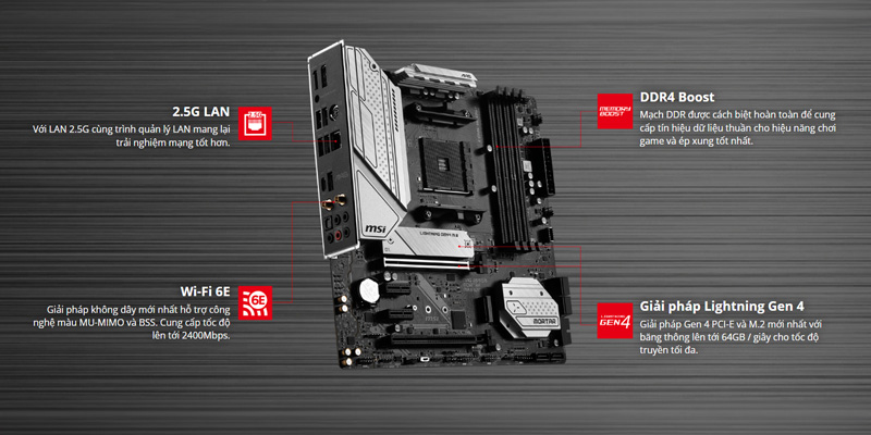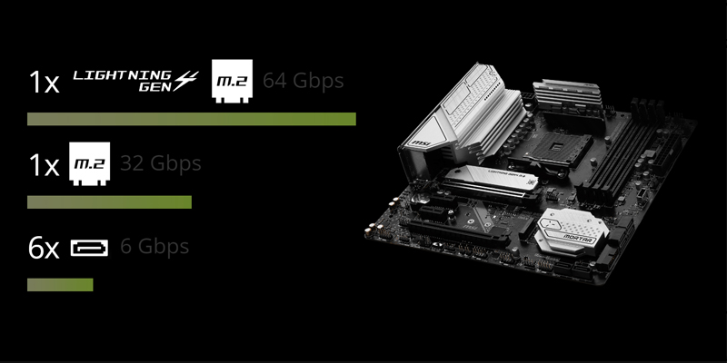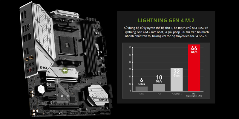 Mainboard PC MSI MAG B550M MORTAR MAX WIFI sử dụng bộ xử lý Ryzen thế hệ thứ 3, bo mạch chủ MSI B550 có Lightning Gen 4 M.2 mới nhất, là giải pháp lưu trữ trên bo mạch nhanh nhất trên thị trường với tốc độ truyền lên tới 64 Gb /s.