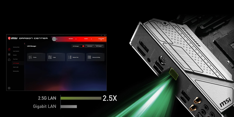 Mainboard PC MSI MAG B550M MORTAR MAX WIFI trang bị kết nối mạng LAN 2,5Gbps cung cấp tốc độ truyền dữ liệu đáng kinh ngạc nhanh hơn so với Gigabit LAN nói chung. Đây là một giải pháp cao cấp cho người dùng khó tính