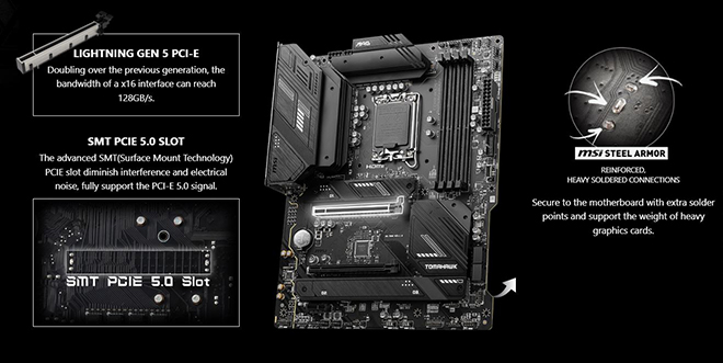 Lighting PCIe Gen 5 M.2 Mainboard PC MSI MAG B760M TOMAHAWK WIFI DDR4 với giao diện PCIe x16 5.0 cho băng thông lên đến 128Gbps và cung cấp hỗ trợ NVMe SSD RAID để tăng hiệu suất đáng kinh ngạc. Tạo cấu hình RAID với thiết bị lưu trữ PCIe để tận hưởng tốc độ truyền dữ liệu nhanh nhất. |