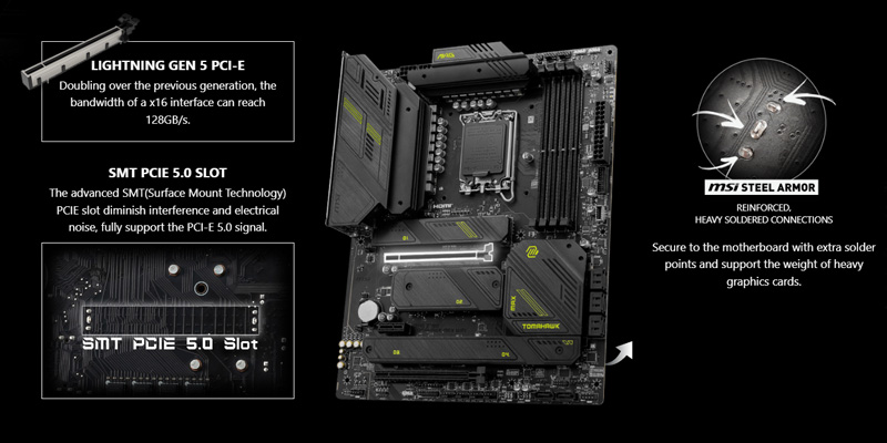 Mainboard PC MSI MAG Z790 TOMAHAWK MAX WIFI trang bị khe cắm PCI-E SMT (Surface Mount Technology) tiên tiến giúp giảm nhiễu và nhiễu điện, hỗ trợ đầy đủ băng thông cao hơn và tốc độ truyền tín hiệu nhanh hơn.