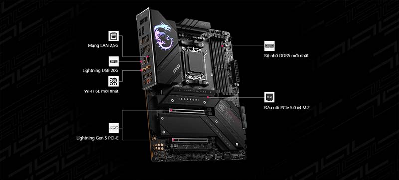 DRAM OverClocking MSI MPG X670E CARBON WIFI hỗ trợ ép xung RAM DDR5 đến 6600MHz, cung cấp khả năng truy cập băng thông bộ nhớ và bổ sung các vùng che chắn giúp giảm đáng kể nhiễu xuyên âm |