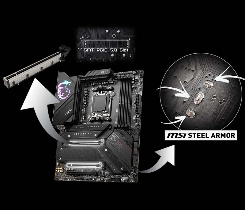 Lighting PCIe Gen 5 MSI MPG X670E CARBON WIFI với giao diện PCIe x16 5.0 cho băng thông lên đến 128Gbps nhờ trang bị khe cắm PCI-E SMT (Surface Mount Technology) tiên tiến giúp giảm nhiễu và nhiễu điện, hỗ trợ đầy đủ băng thông cao hơn và tốc độ truyền tín hiệu nhanh hơn |