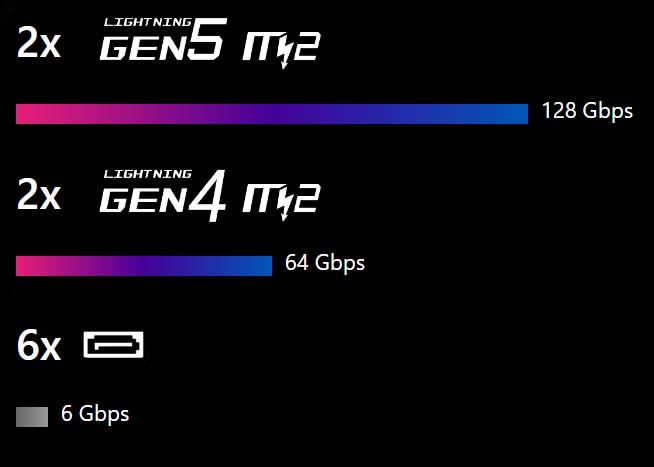 Hỗ trợ M.2 PCIe Gen 5 MSI MPG X670E CARBON WIFI cung cấp đến 4 khe cắm M.2 hỗ trợ tốc độ truyền dữ liệu với hiệu suất đáng kinh ngạc. Hơn nữa trong đó có một khe cắm M.2 hỗ trợ PCIe 5.0 với tốc độ truyền dữ liệu lên đến 128 Gbps cho phép thời gian khởi động và tải ứng dụng nhanh hơn. |