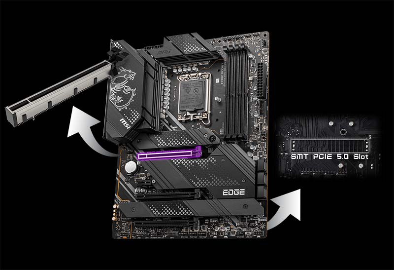 Lighting PCIe Gen 5 MSI MPG Z690 EDGE WIFI với giao diện PCIe x16 5.0 cho băng thông lên đến 128Gbps nhờ trang bị khe cắm PCI-E SMT (Surface Mount Technology) tiên tiến giúp giảm nhiễu và nhiễu điện, hỗ trợ đầy đủ băng thông cao hơn và tốc độ truyền tín hiệu nhanh hơn |