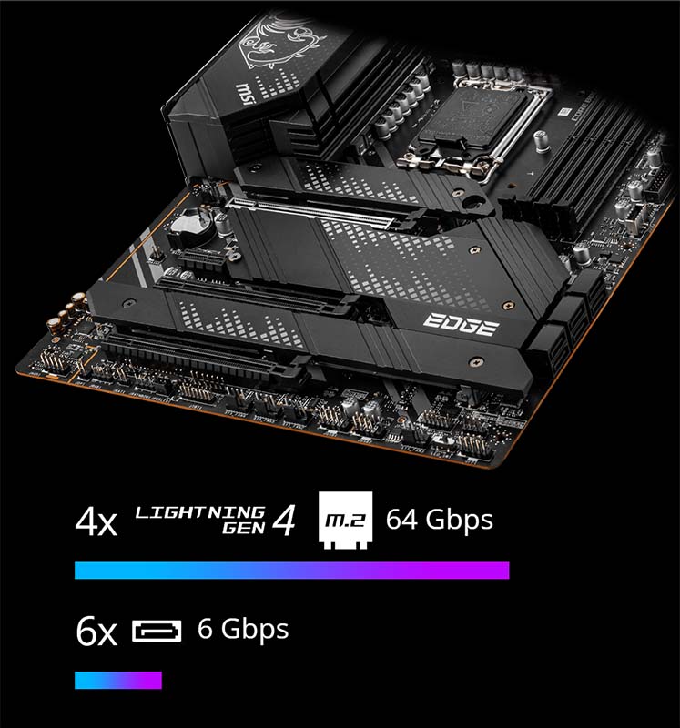 Hỗ trợ M.2 PCIe Gen 4 MSI MPG Z690 EDGE WIFI hỗ trợ khe cắm M.2 PCIe 4.0 và cung cấp hỗ trợ NVMe SSD RAID để tăng hiệu suất đáng kinh ngạc. Tạo cấu hình RAID với thiết bị lưu trữ PCIe để tận hưởng tốc độ truyền dữ liệu nhanh nhất. |