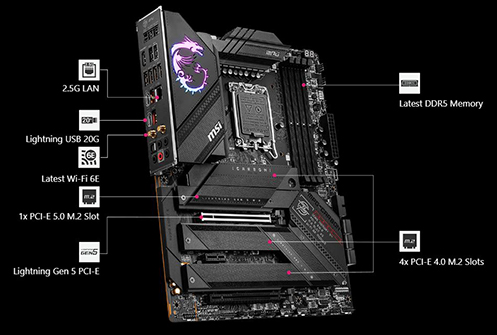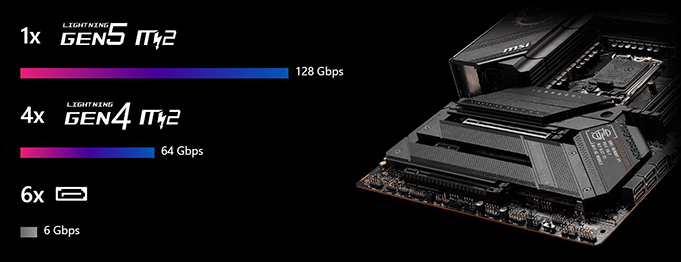 Hỗ trợ M.2 PCIe Gen 5 MSI MPG Z790 CARBON WIFI hỗ trợ khe cắm M.2 PCIe 4.0 và cung cấp hỗ trợ NVMe SSD RAID để tăng hiệu suất đáng kinh ngạc. Tạo cấu hình RAID với thiết bị lưu trữ PCIe để tận hưởng tốc độ truyền dữ liệu nhanh nhất. |